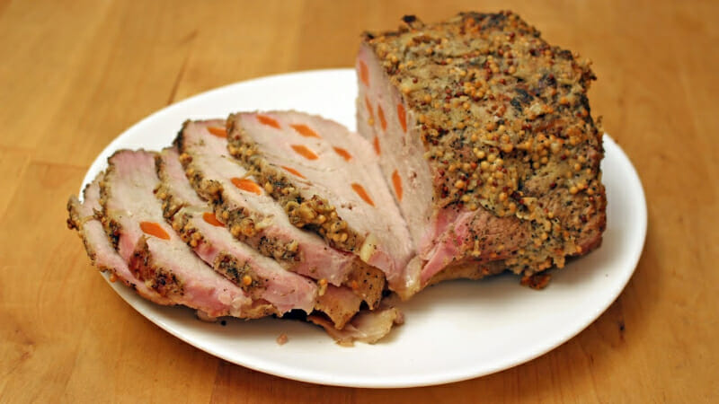 - Внутри мяса сделать несколько поперечных отверстий и вставить в них нарезанную морковь и чеснок.