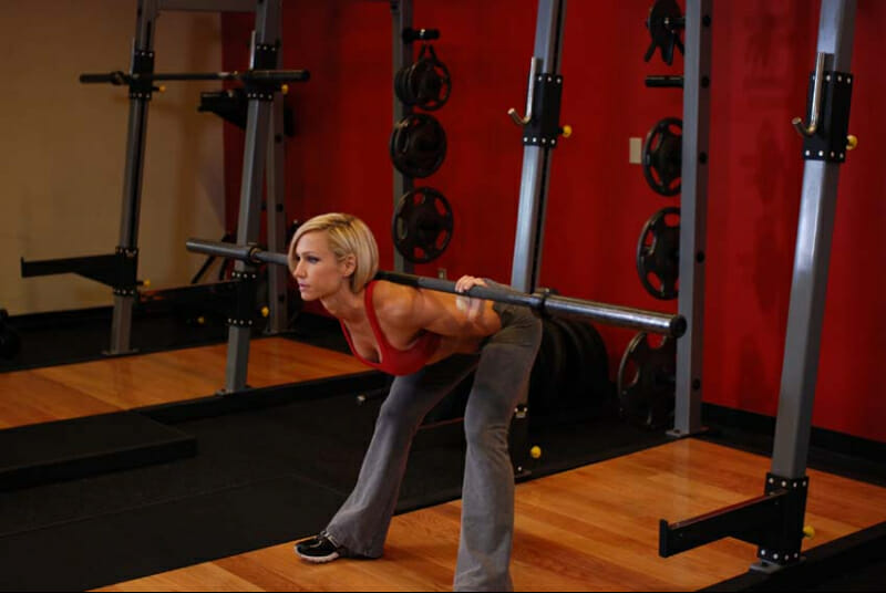 - Встать лицом к штанге, установленной на опоре, выровнять спину, а ноги поставить немного шире, чем ширина плеч.