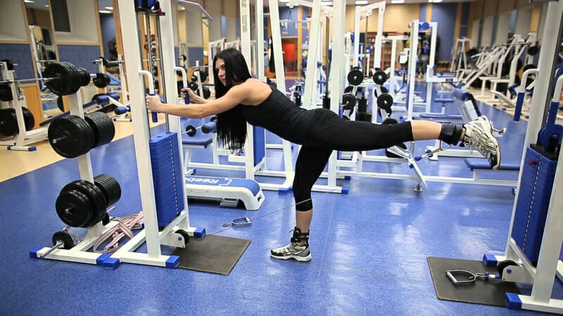 - Опереться на рычаги блока руками, чтобы снять нагрузку со спины, и отводить ногу максимально назад без рывков, равномерным движением.