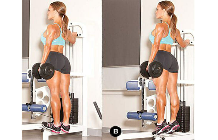 Подъемы на носки для прокачки икр можно совершать с собственным весом или использовать утяжелитель в виде гантели. Кроме икроножной мышцы косвенно прорабатываются мышцы бедер и ягодиц.