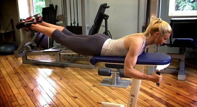 Данный вид гиперэкстензии — упражнение, при котором поднимать вверх нужно не корпус тела, а ноги. При этом работает бицепс бедра и нижняя часть ягодиц.