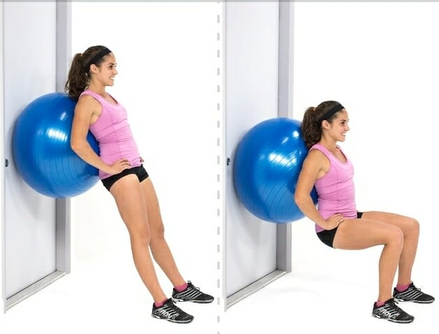 - Между стеной и спиной разместить фитбол, ноги выставить на полушаг вперед, подобно исходному положению для приседаний в машине Смита.