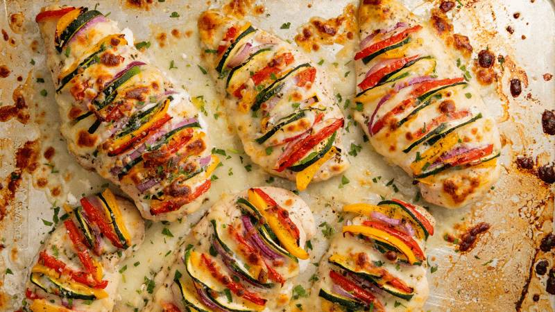 - В грудку в каждый надрез укладывать по кусочку овоща и сыра.