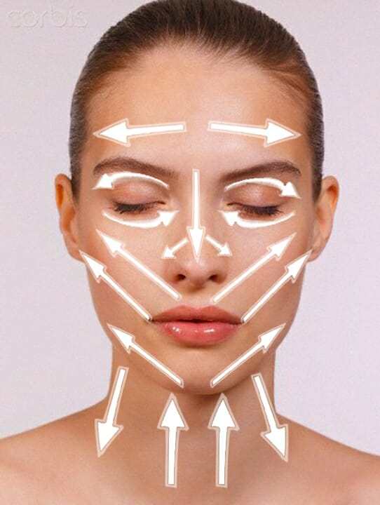 - Смесь распределяют по направлению кожных линий – от подбородка и от крыльев носа к вискам, от верхней губы к ушам.