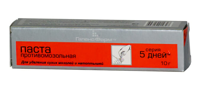 Выпускается на основе бензойной и салициловой кислот. Непосредственно перед применением средства необходимо обрабатывать пораженные участки вазелином, чтобы снизить риски развития раздражения и ожога. Время нанесения — не более 2 часов, курс необходимо проводить до полного исчезновения натоптышей.