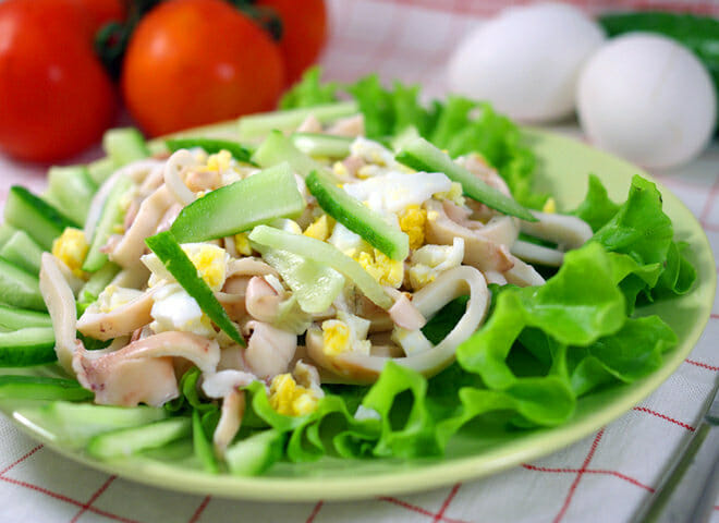 - Сыр и яйцо натирают на средней терке. Огурец режут соломкой. Листья салата рвут руками. Из банки тунца сливают сок и измельчают рыбу вилкой.