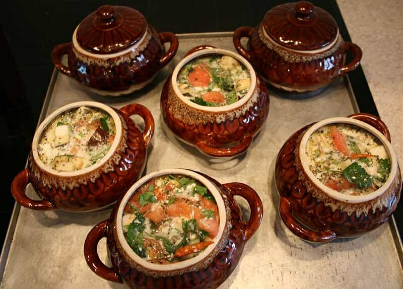 - В каждую тарелку раскладывают мясо и заливают сырным бульоном.