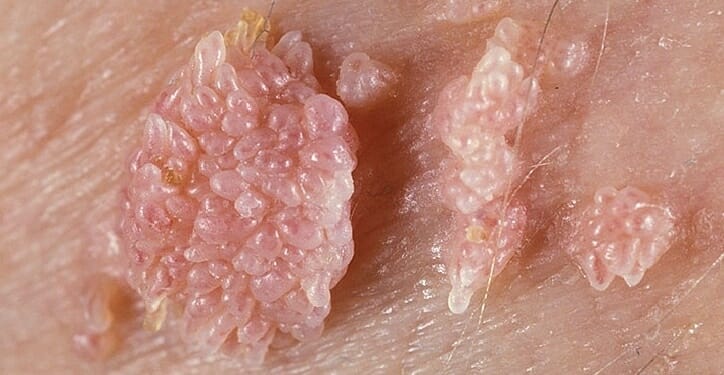 Мягкие сосочковидные образования на ножке, которые на вид напоминают цветную капусту. Возникают чаще всего в области промежности, на коже гениталий. Несколько реже кондиломы появляются в подмышечных впадинах, на лице, в ротовой полости. Причина — заражение вирусом папилломы человека.