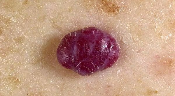Доброкачественная опухоль, которая развивается из клеток эндотелия — внутренней оболочки сосудистой стенки. Гемангиома имеет вид красноватого, багрового или синюшного пятна, которое незначительно приподнимается над поверхностью кожи. Контуры неправильные, в ее области можно заметить расширенную сосудистую сетку. Главные отличительные признаки — тенденция к быстрому росту и осветление после нажатия на несколько секунд.