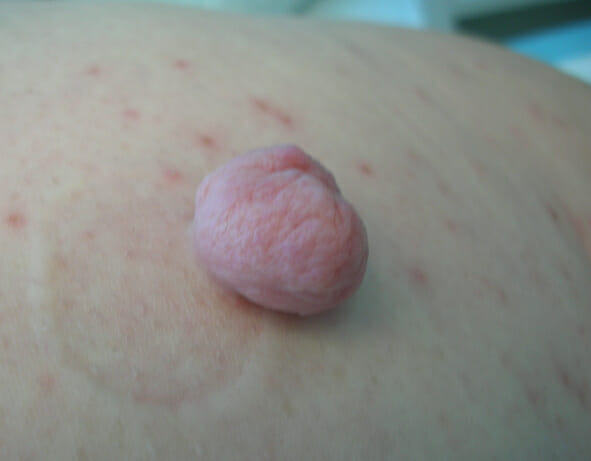 Доброкачественное новообразование, состоящее из зрелых элементов соединительной ткани. Имеет четкие границы, цвет — телесный либо светло-розовый. Нередко грибовидной формы, на фото изображена разновидность на ножке. Развивается медленно.