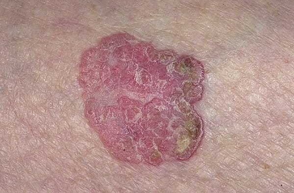 На коже сначала появляется красное уплотнение небольшого размера с неровными краями. Затем оно растет в размерах и превращается в шелушащуюся бляшку желтовато-красного цвета с неровными краями. Сухие чешуйки часто вызывают зуд. Затем утолщается эпидермис, появляются бородавковидные разрастания.