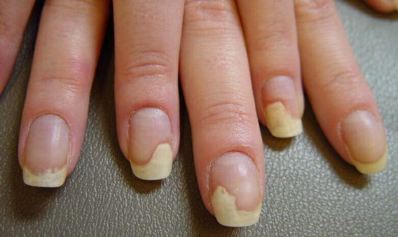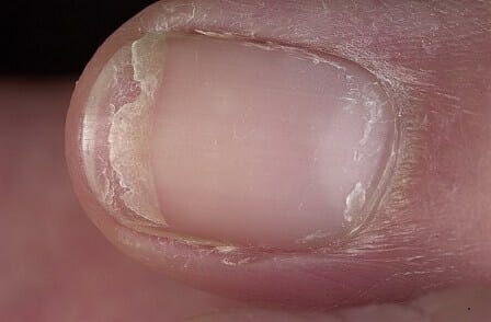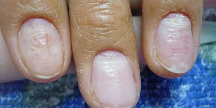 Эта патология часто появляется после удаления кутикулы. Сначала возникает белое пятно в этой области, а потом грибок проникает в клетки ногтевого ложа, что приводит к полному разрушению ногтя, который еще даже не вырос.