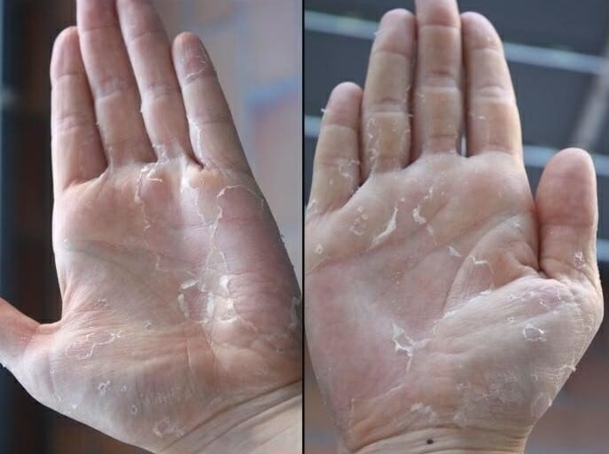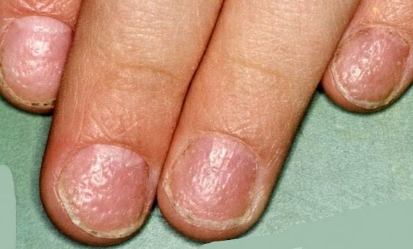 Если у больного наблюдается грибковое поражение кожи, то возникает шелушение. Некоторые виды инфекции могут поражать дерму одновременно с ногтями.