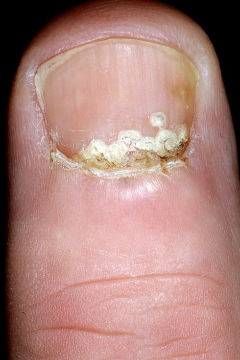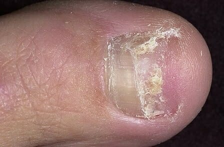 Сначала грибок поражает наружный конец ногтя, а потом переходит к кожному валику. Зона роста остается неизмененной большее количество времени.