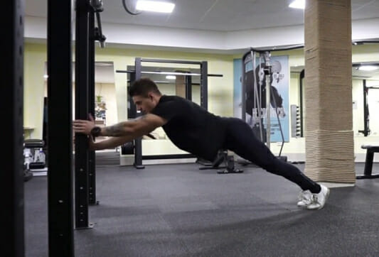 - Принять исходное положение классической планки с опорой на прямые руки.