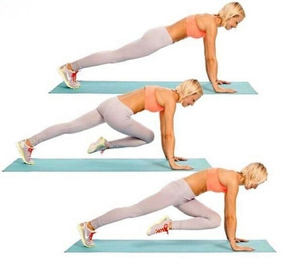 - Поочередно подтягивать левое колено с правому локтю, правое — к левому.