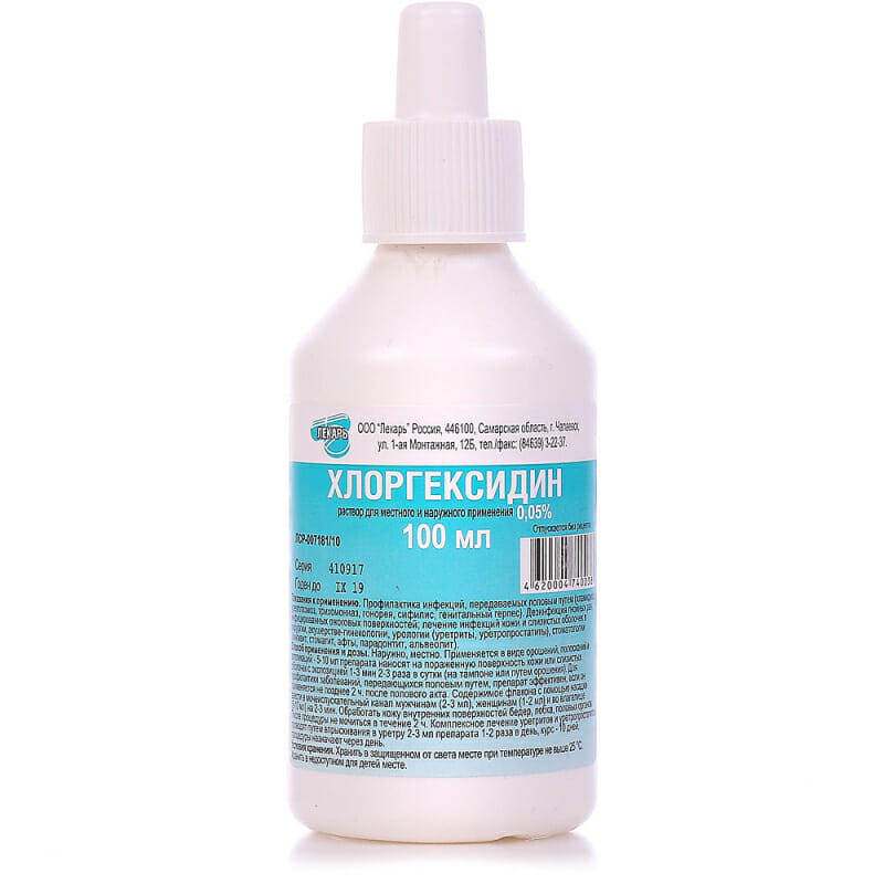 К аптечным противомикробным средствам относят раствор хлоргексидина. Препарат оказывает бактерицидное действие на слизистые оболочки, кожные покровы, поэтому используется для лечения прыщей на груди. После нанесения раствор не впитывается в кровоток. Его нужно наносить на кожу чистым ватным диском и оставлять высыхать.