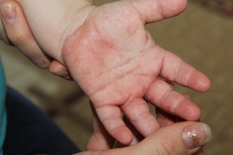 - Окунуть в жидкость руку, между пальцами которой появилось покраснение.