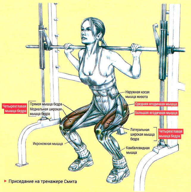 В процессе выполнения приседаний в тренажере Смита задействуется множество мышц. Прежде всего, это квадрицепсы, ягодицы, бицепс бедра и икроножные. Небольшую нагрузку получает пресс.