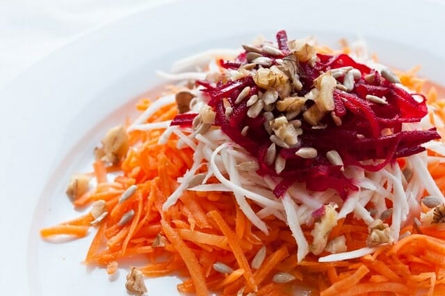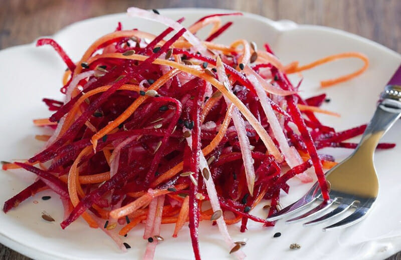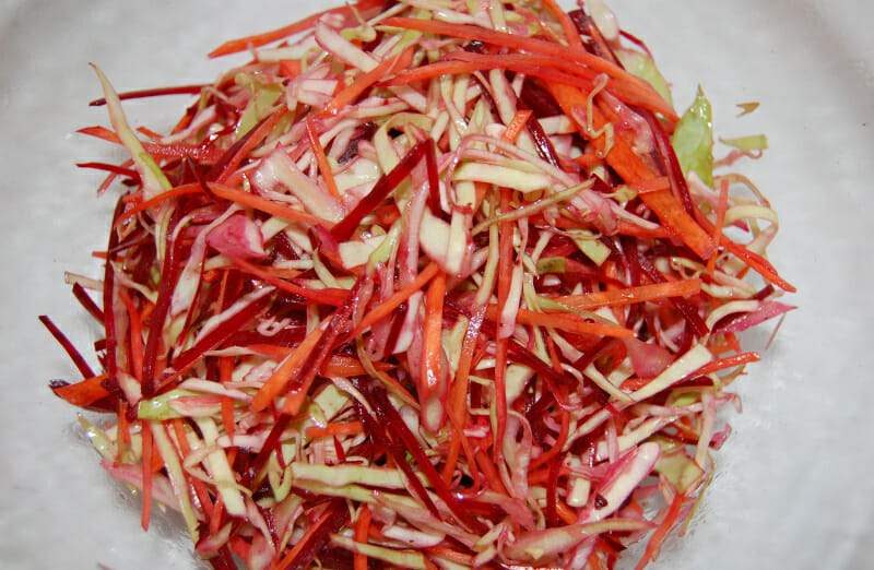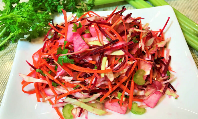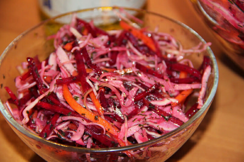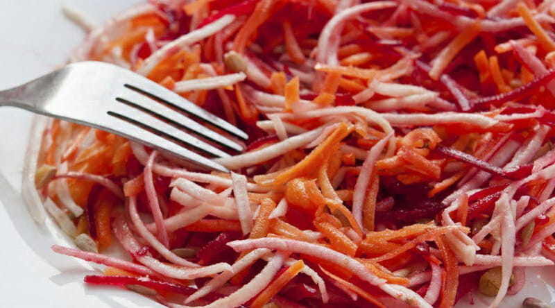 Состоит из грубой клетчатки: капуста, морковь, свекла (все овощи СЫРЫЕ, их нужно натереть на крупной терке), зелени (добавляйте побольше разной) и качественного нерафинированного масла. Действует на кишечник как ершик — соскабливает шлаки и слизь со стенок и выводит из организма.