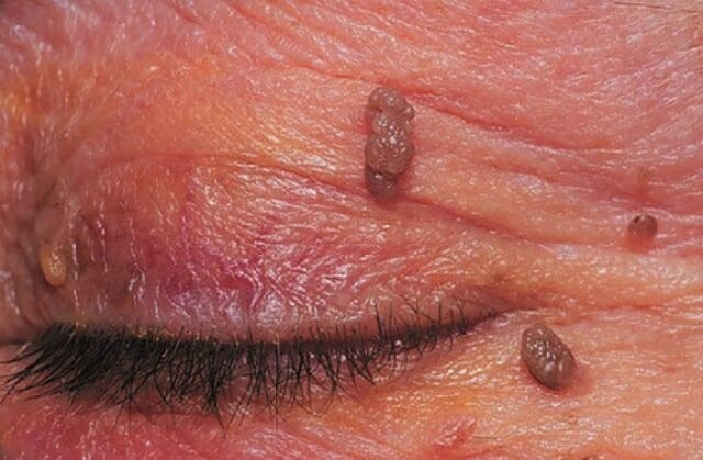 Папилломы являются доброкачественными новообразованиями, но некоторые их виды способны перерождаться в злокачественные опухоли. Наросты локализуются на коже лица, в основном на глазном веке, щеках, подбородке и в области лба, а также на волосистой части головы.