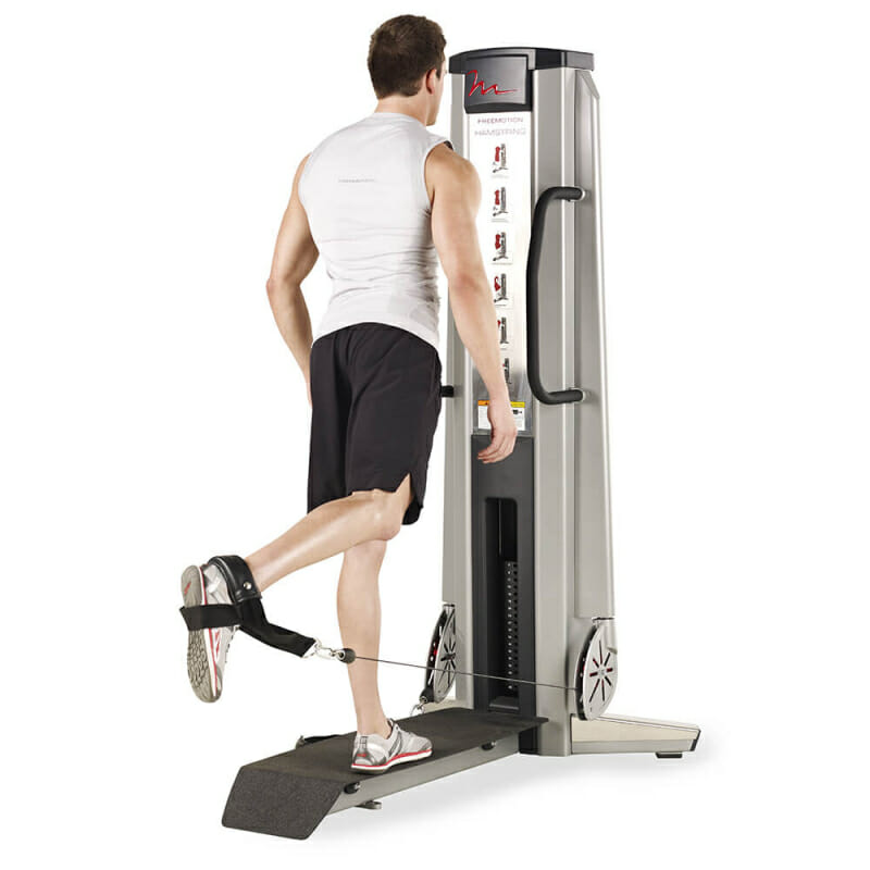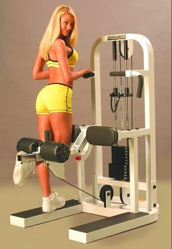 - Встать в тренажер и завести под валик одну ногу так, чтобы он оказался чуть выше щиколотки. Для этого может потребоваться отрегулировать высоту тренажера.