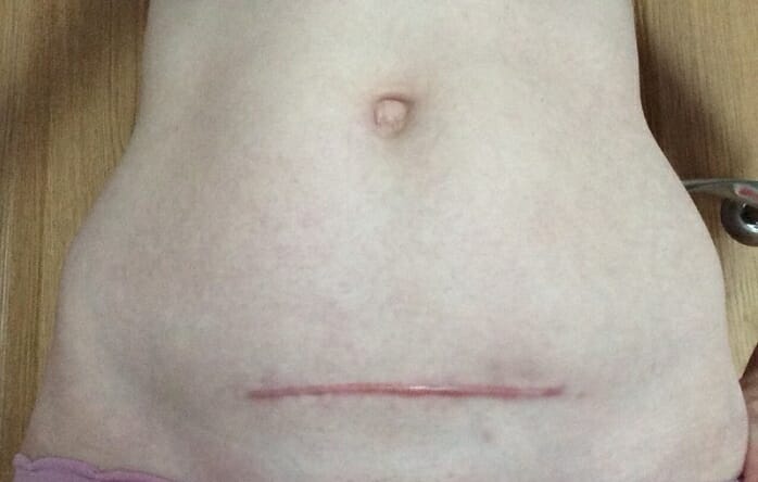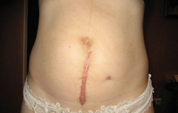 Вертикальный шов довольно заметный, поскольку его ширина может составлять до 2 см. Он долго заживает, разрастается со временем и преобразовывается в рубцовую ткань.