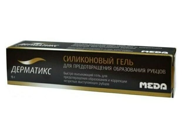 Гель препятствует образованию рубцовой ткани, нормализует водный баланс и выравнивает оттенок кожи. В нем содержатся диоксид кремния, полисилоксан | Шрам следует смазывать 2 раза в день. Продолжительность курса — 60 суток |