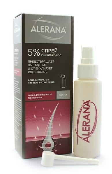 Алерана — это негормональный спрей, действующим компонентом которого является миноксидил. Средство бывает 2% и 5%. По результатам исследований, у 87% пациентов усилился рост волос. Спрей останавливает выпадение, укрепляет волосы и улучшает их состояние уже через 6 недель.