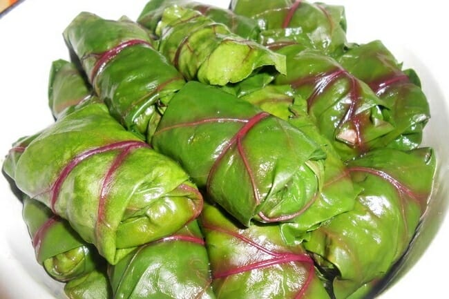 - Заворачивают начинку в ботву от свеклы.