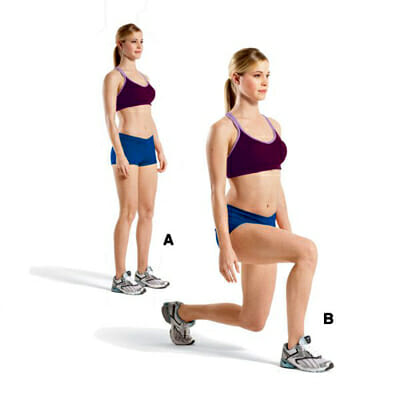 Количество подходов — четыре. Опорную ногу во время выпада следует немного сгибать в коленном суставе.
