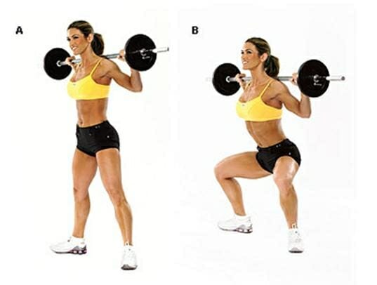 - Приседания со штангой, выпады, мертвая тяга, планка на мячах, подтягивания ног к турнику.