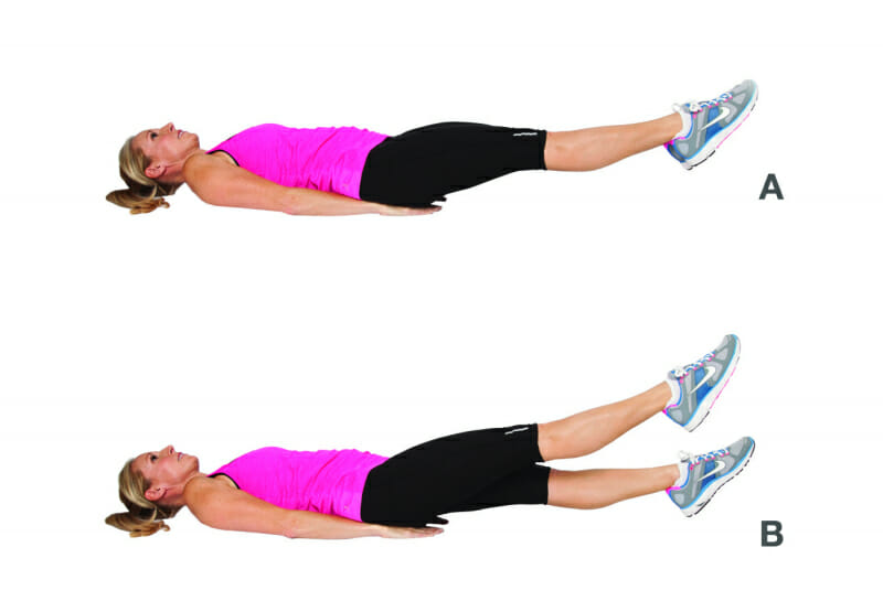 - В течение 40 секунд сделать перекрестные поднятия и опускания ног в вертикальной плоскости.
