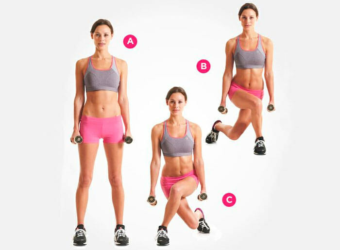- Среда: подъем гантелей в наклоне, выпады «реверанс» на месте.