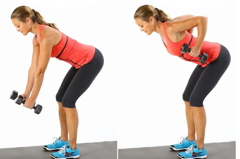 - Тяга гантелей в наклоне — 10 повторов.