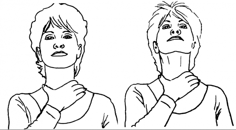 - С заметным усилием напрягать мышцы шеи и подбородка.