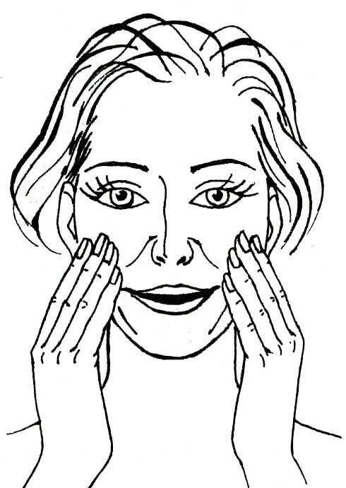 - Небольшими круговыми движениями указательными пальцами массировать щеки, начиная от уголков губ по направлению к ушам.