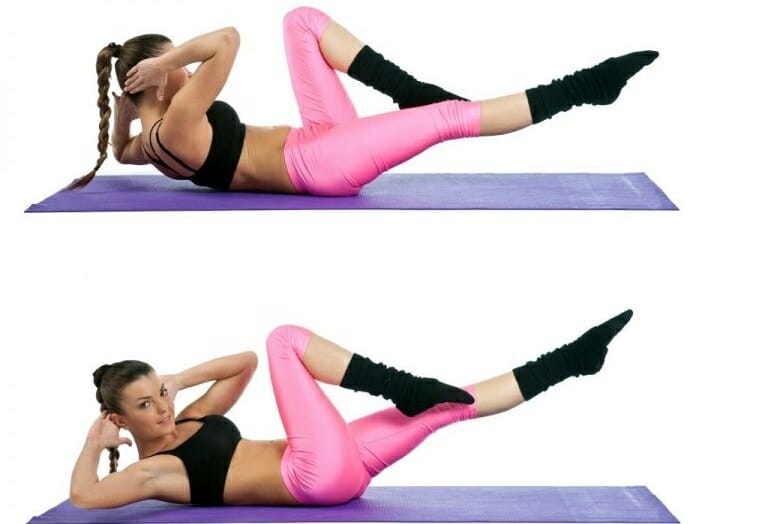 - После этого можно начинать попеременные движения ногами и корпусом — сначала левым локтем необходимо дотянуться до правого колена. Затем выпрямить правую ногу и дотянуться правым локтем до левого колена.