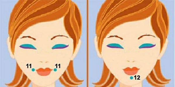 - Рот. Пальцы располагают посередине подбородка. После этого, немного надавливая, двигаются к точке под носом. Если имеются носогубные складки, траектория будет оканчиваться под ними.