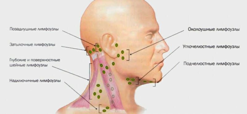 - лимофоузлам, которые располагаются в районе уха и затылка;